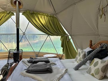 2026 Humble Dome is booked including the following: Double bed with a a Kingsize duvet, and 4 pillows. Full size bunk beds with Single duvet and 1 pillow per bed. Put up beds available for additional guests or a lower level sleeping arrangement. LINEN is to be provided by yourselves or booked as an additional extra - see prices on our bookings page. Electricity is now available, 2 sockets for light use (no hair straightners) 2 USB chargers- all run from SOLAR POWER, small cool box powere